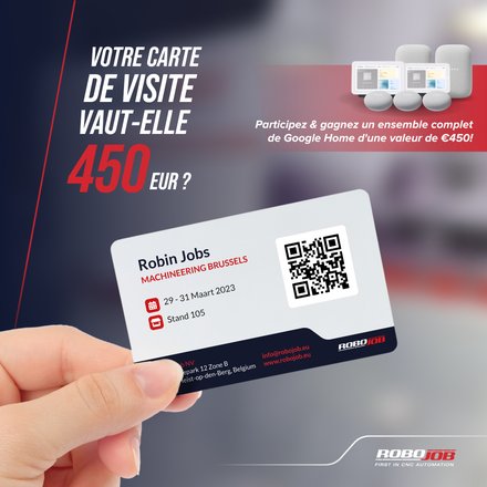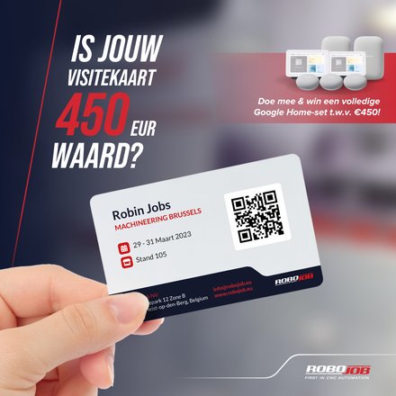 Besides Coby, RoboJob will also reveal a new application to the existing Mill-Assist. Thanks to a new partnership with HWR, workpieces and small pallets can now be loaded and unloaded with the Mill-Assist. Clearly this is reason enough to stop by RoboJob during Machineering. RoboJob also plans to unveil another bonus: "In the context of automation, we will also be raffling off an 'Automation pack' from Google Home at our stand," De Roovere reveals. "We will throw the business cards of all our visitors in a drum and draw a winner at the end of the trade fair. This way, we will bring automation not only to our customers in the work floor, but also at home."