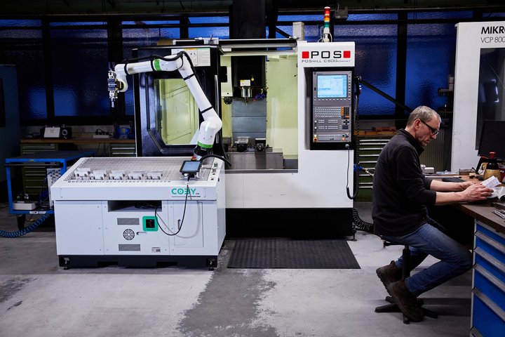 Thomas Feldner a pris connaissance de la solution robotique pour le chargement et le déchargement des machines grâce àun article sur coboworx. Après avoir répondu à quelques questions du configurateur en ligne, il s'est rendu compte qu'il recherchait une solution de ce type : une solution cobot qui peut être mise en place sans connaissances spécialisées, qui ne nécessite pas de scanner ou de clôture supplémentaire et qui est donc entièrement accessible. Il a également trouvé que sa flexibilité était un grand avantage, car un chariot élévateur peut facilement repositionner la solution robotique compacte. Cela signifie que le centre d'usinage le plus approprié peut toujours être mis à niveau et son utilisation optimisée.