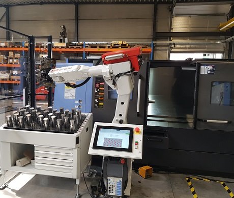 Dat is ook de reden waarom we ondertussen ook al een tweede automatisering hebben aangeschaft. De eerste kwam er al in 2017: met onze eerste robot kunnen we zowel een Brother freesmachine als een Mazak draaimachine automatiseren. We kunnen deze robot van de éne naar de andere machine verplaatsen. Het is een kwestie van 6 bouten los te vijzen en je kan het geheel dan verplaatsen en inpluggen aan de andere machine. In de praktijk doen we dat echter niet zo vaak: het heeft meer zin om ervoor te zorgen dat je voldoende werk hebt voor één machine en dan laat je daar de robot zoveel mogelijk op werken.